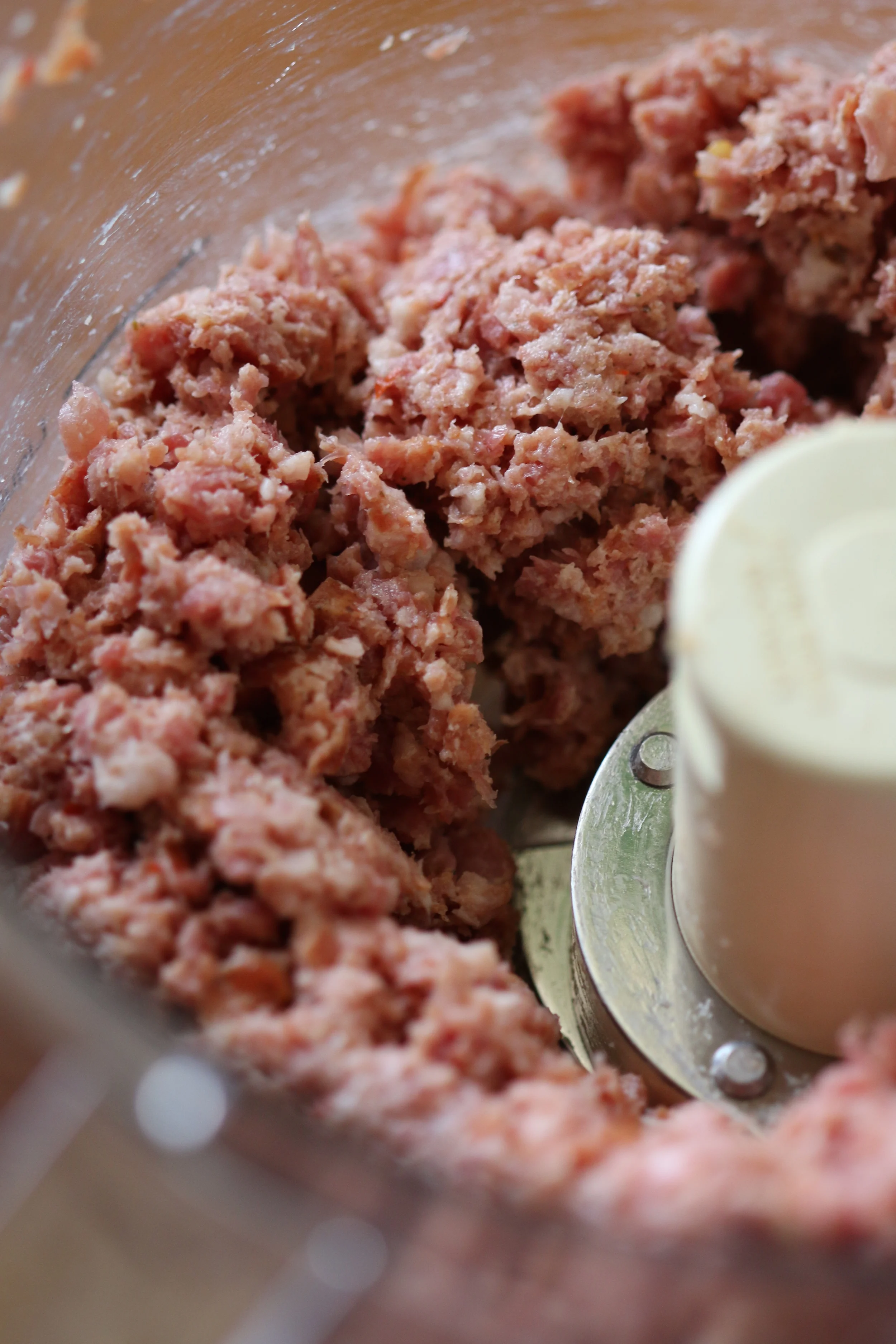 Chop half of the andouille sausage into bite size pieces, and finely chop the remaining half of the sausage for added texture. Using a food processor makes it easy to finely chop multiple batches of andouille sausage. We have to make multiple batches to fill all the requests for this recipe.
