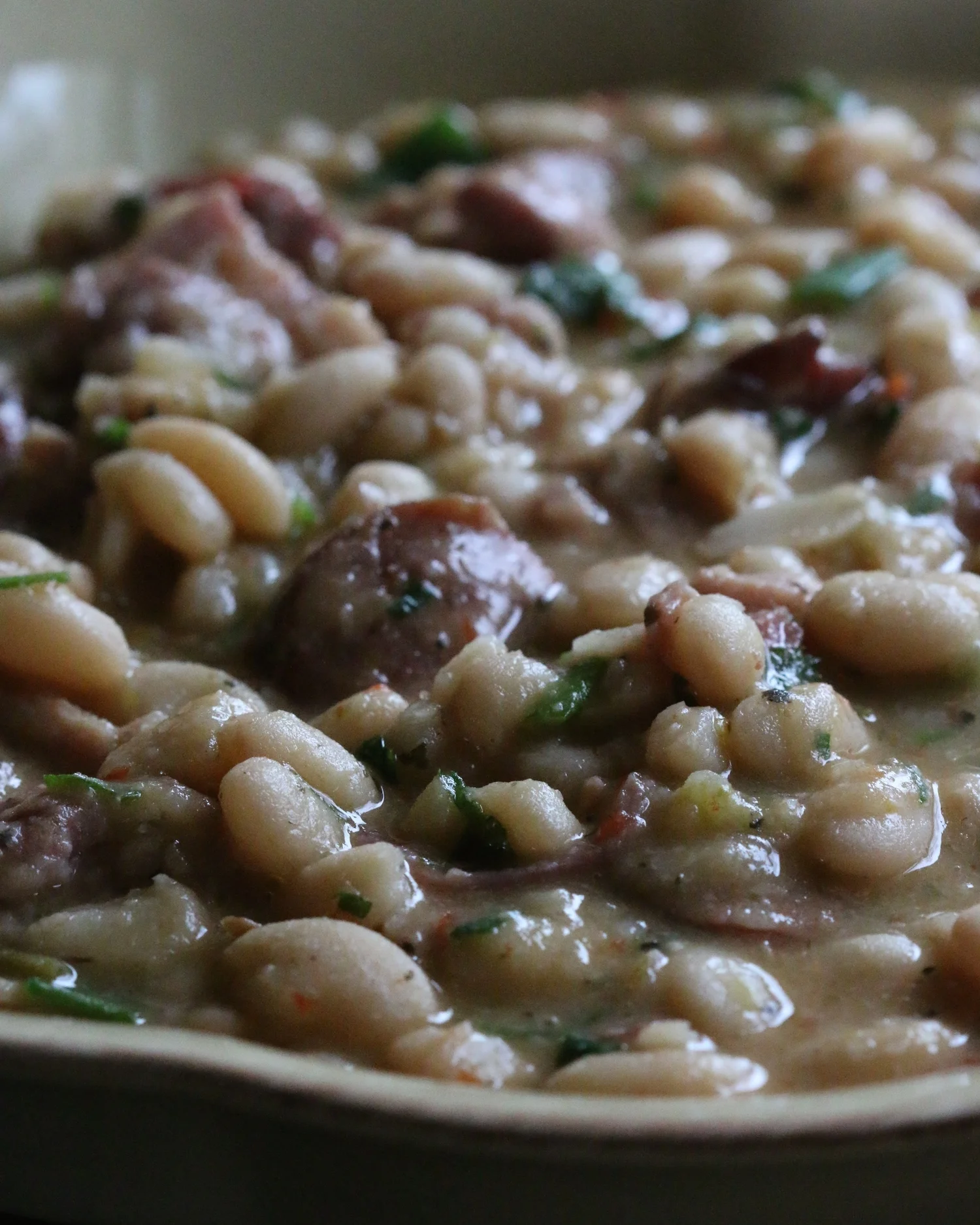 Once the beans are plump add the chopped sausage and 2 more cups of water. Continue to cook for 1 to 1 1/2 hours on a low simmer in an uncovered pot. The beans are finished cooking when they are creamy and the broth has thickened.