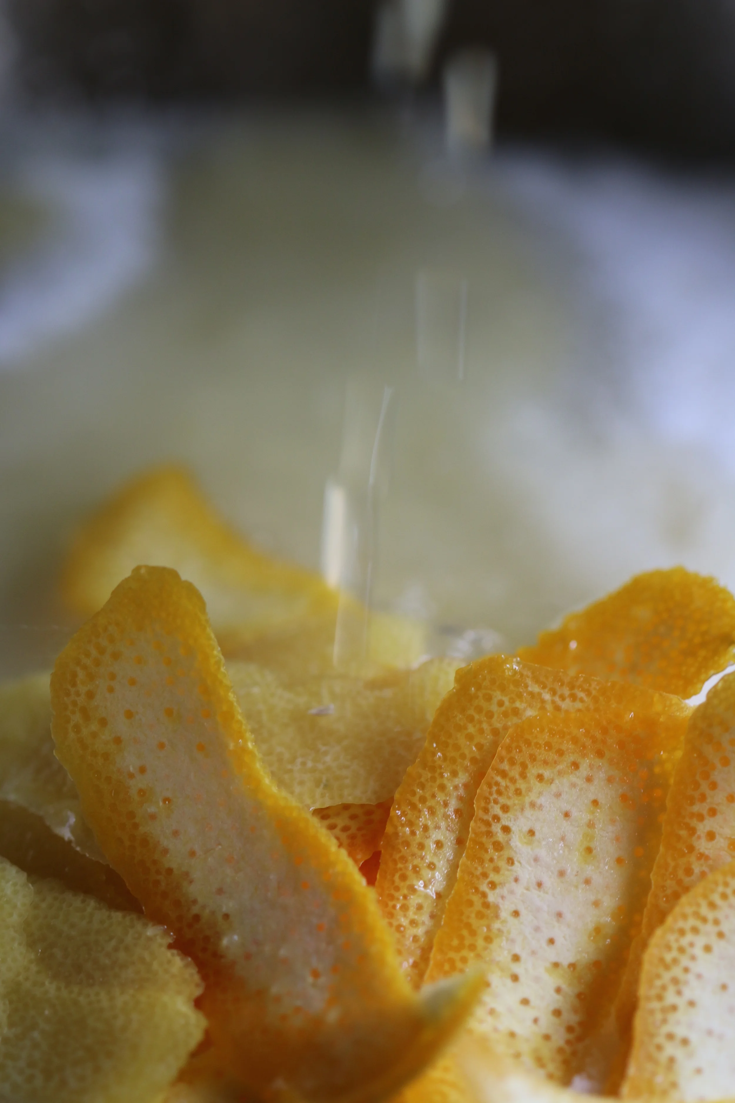 2. In a large nonreactive pan, add the sugar, orange juice, lemon juice, water, orange zest and lemon zest. Bring to a boil and reduce to a simmer until the liquid thickens and becomes amber colored, 20-25 minutes