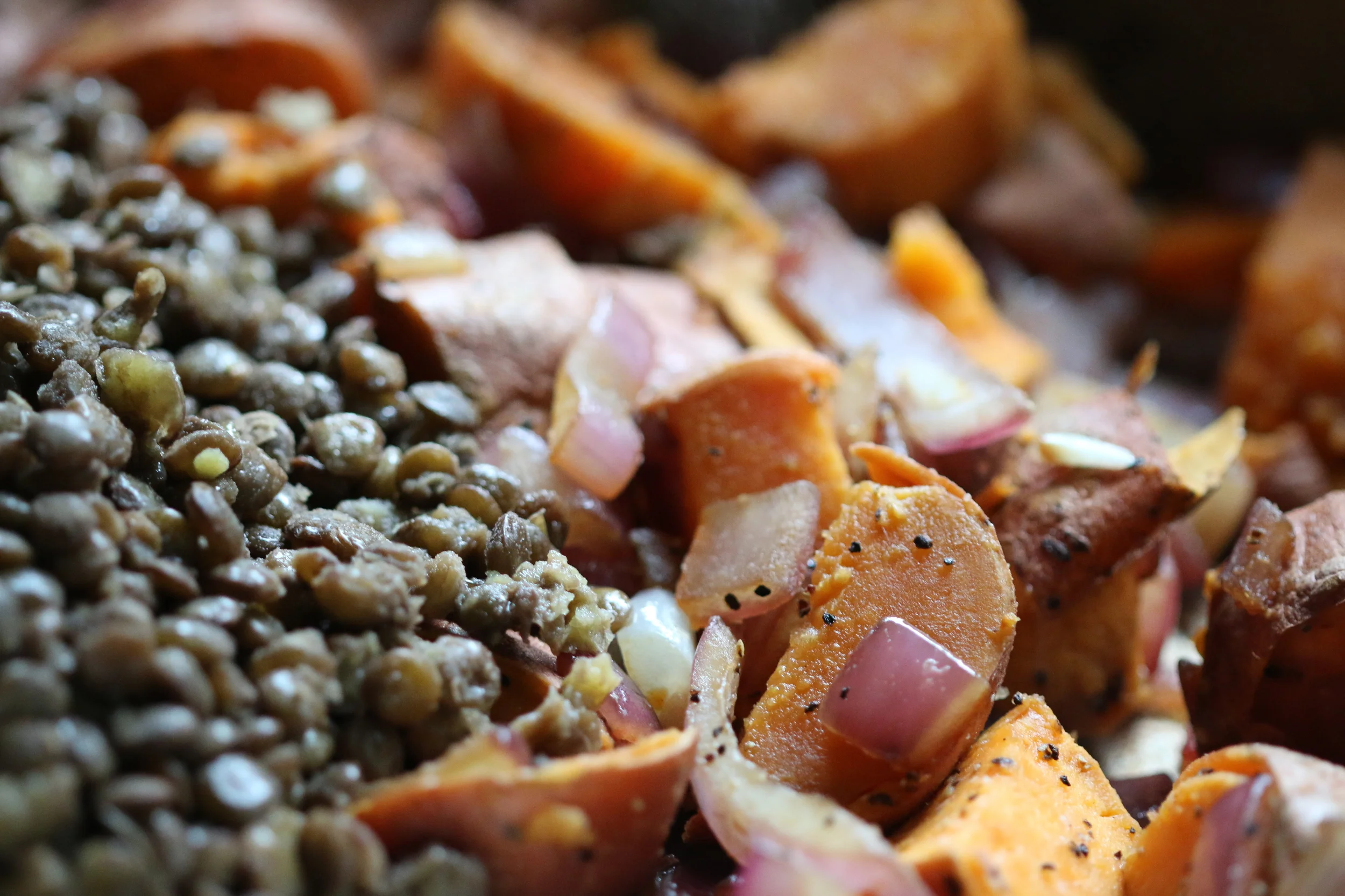 2. Add the potatoes, lentils, salt and pepper to the skillet and sauté until heated. Serve warm.