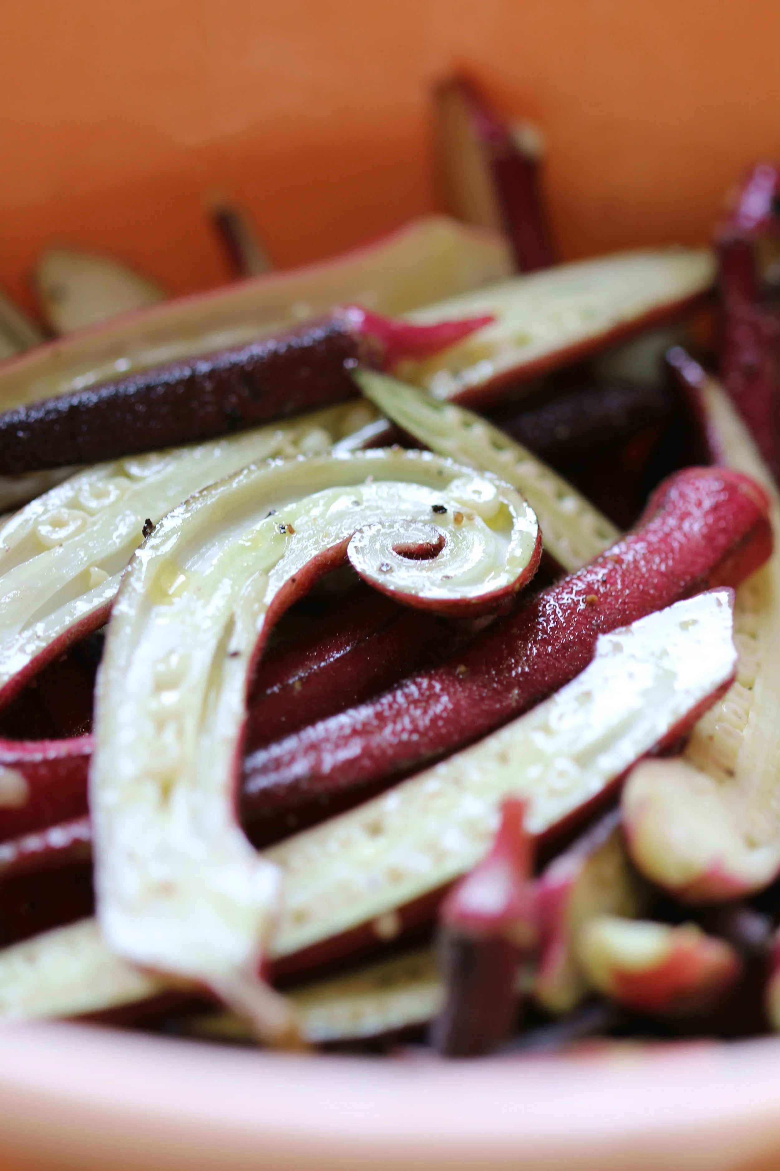 We simply cut each piece in half followed by a quick toss in olive oil, salt and pepper.