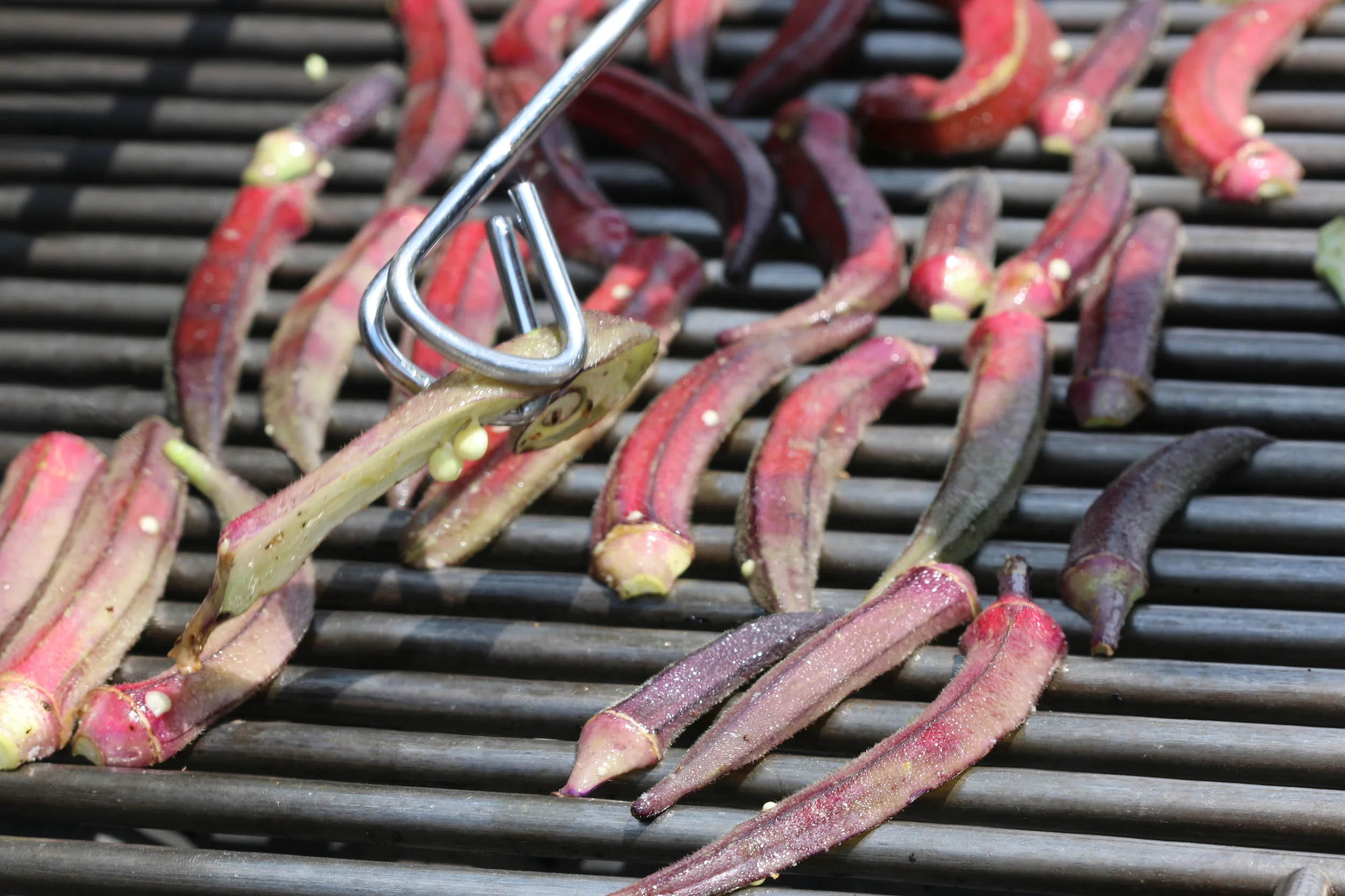 The crimson color deepens shortly after being placed on a heated grill. Within minutes, the okra is ready when browned and slightly charred. Serve warm or at room temperature with a sprinkle of salt.