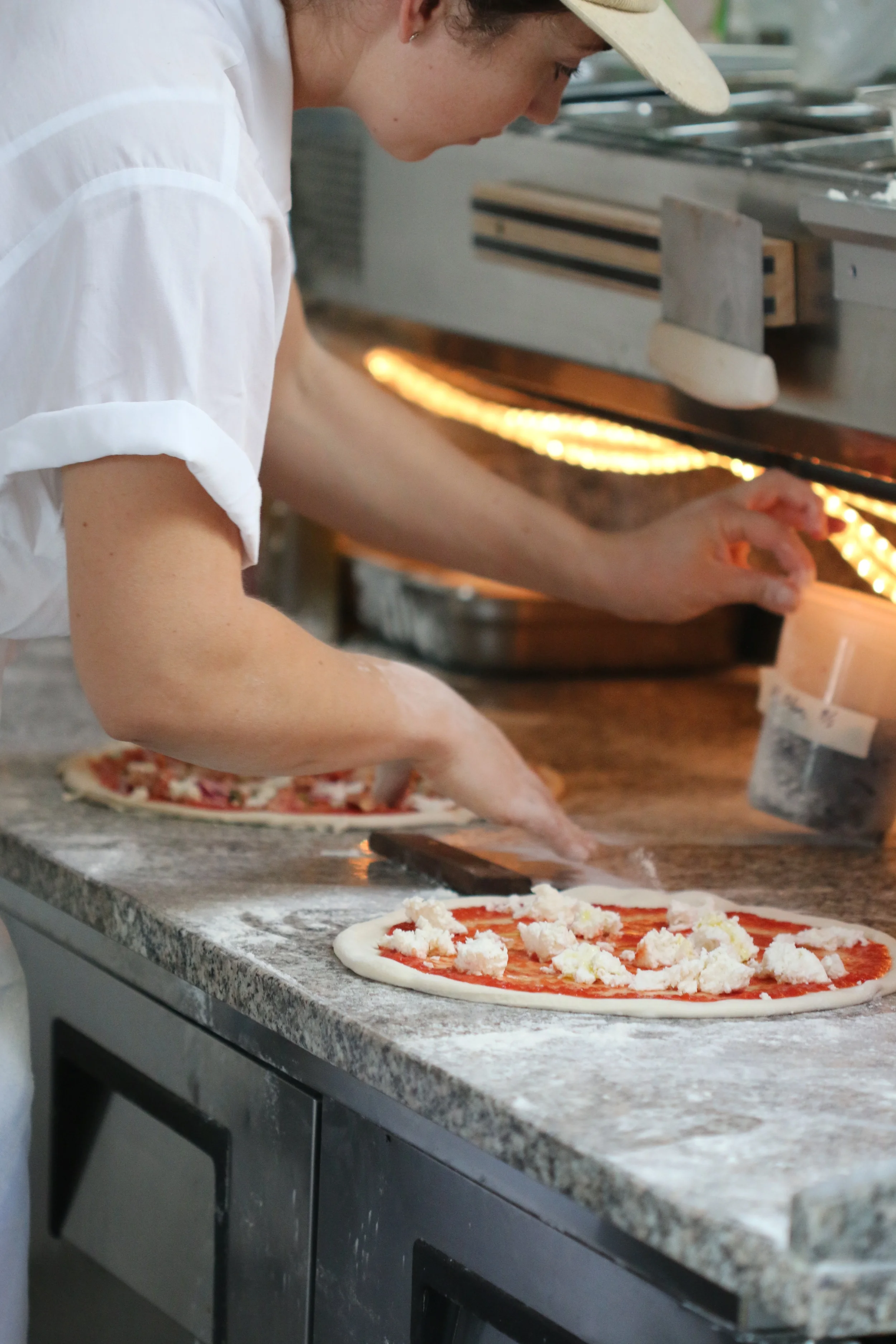 The Bee Sting pizza balances spicy sopressata and chili oil with a touch of honey. The sopressata curls up as the edges char, becoming a perfect vessel for the drizzled honey.