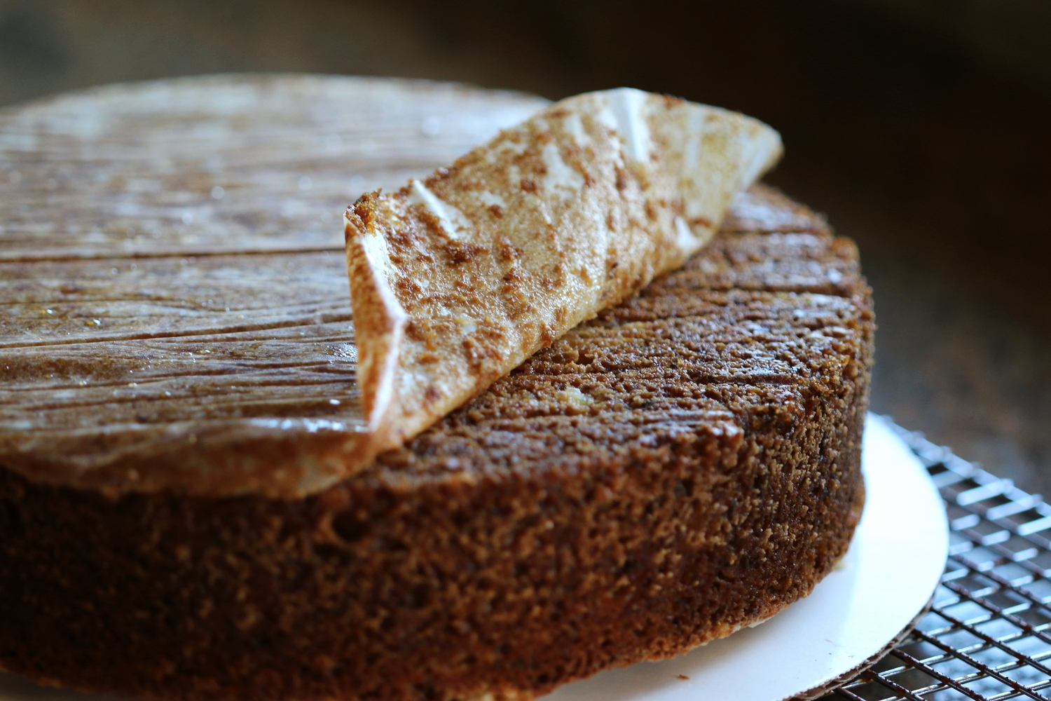 Remove from the oven and set the pan on a cooling rack. When the cake is completely cool run a knife along the inside of the pan to release the sides of the cake. Place a round cake board or a plate on top of the pan. Invert the pan onto the cake board and remove the parchment from the bottom of the cake. Place the cake, bottom side down onto your serving platter.
