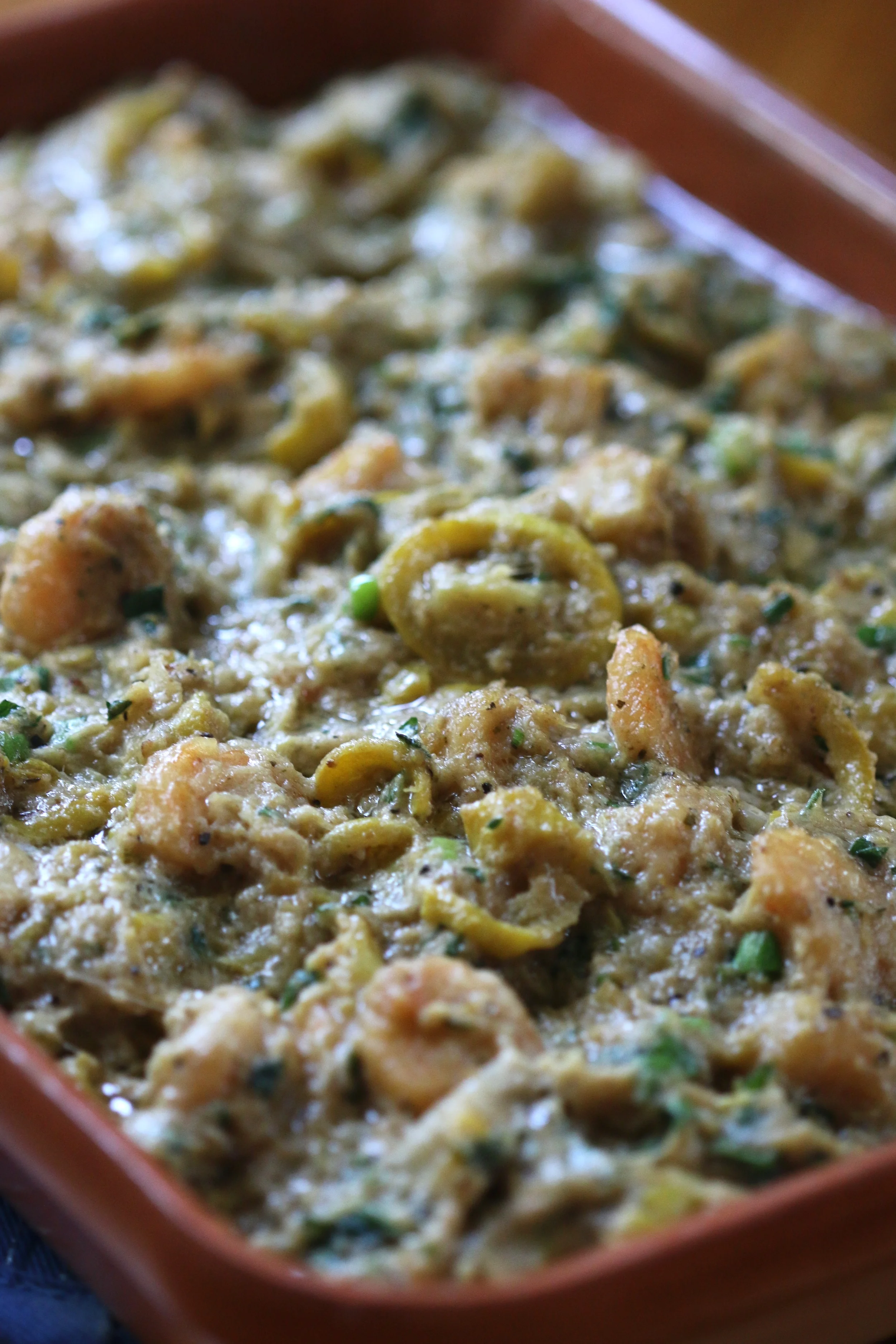 My husband's grandmother was from Avoyelles parish, and an incredible country style cook. She taught me how to make this must have holiday dish. She claimed that you simply add a little of this and a little of that. The one thing she would always stress is that you should look for the smallest squash you can buy. The small ones are much more tender and sweeter than their larger counterparts. I have to agree, the small squash is sweeter, and it blends beautifully with Gulf shrimp.