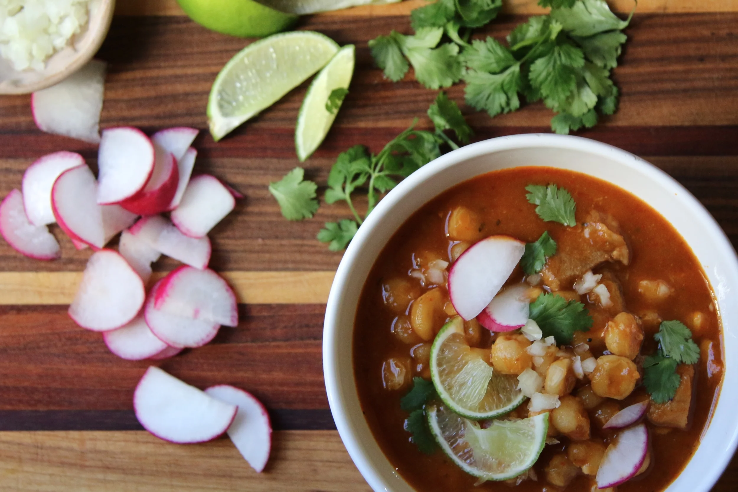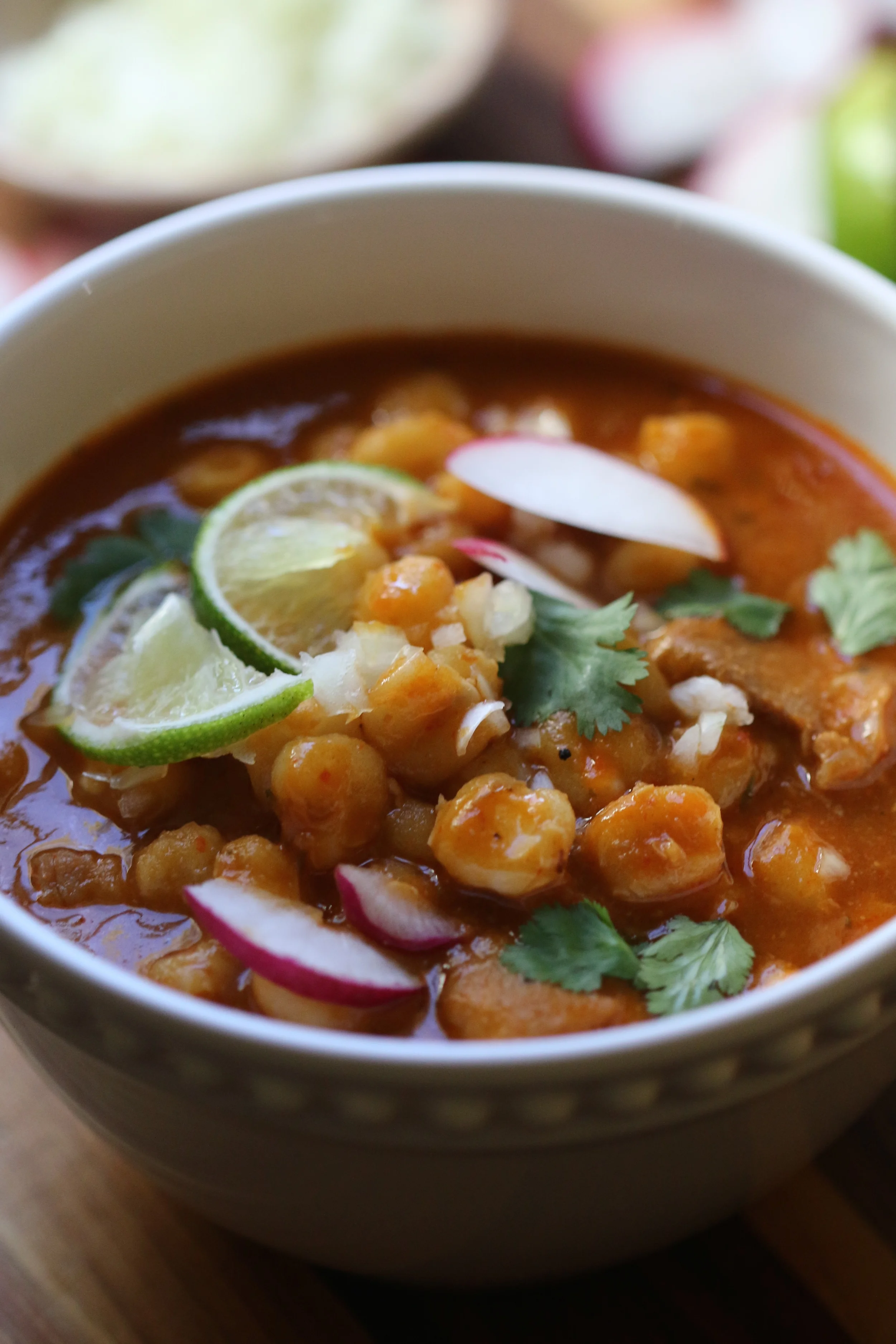 Tender chicken and hominy in a rich chili broth is the foundation of Pozole Rojo. Pozole is often served with a large number of accompaniments that can include lime wedges, onions, avocado, tomato, cilantro leaves, jalapeno peppers, radishes and finely shredded cabbage. Adding a generous squeeze of lime juice to your bowl of pozole is a must. The change in acidity of the broth will give you an authentic Pozole Rojo flavor.