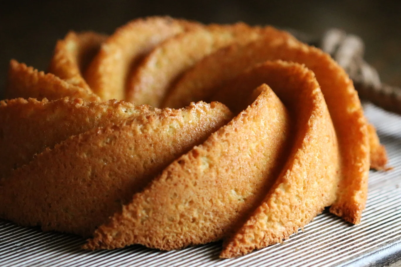 3. In a separate bowl, beat the egg whites until soft peaks form. Fold half of the egg whites into the cake batter. Fold in the remaining egg whites. Coat the bundt pan with a non-stick spray and pour the batter into the pan. Bake until a cake tester inserted into the cake comes out clean, 25-30 minutes. Cool the cake, however, the cake may be removed from the bundt pan and glazed when still a little warm, just handle the cake carefully. A completely cooled cake is easier to handle.