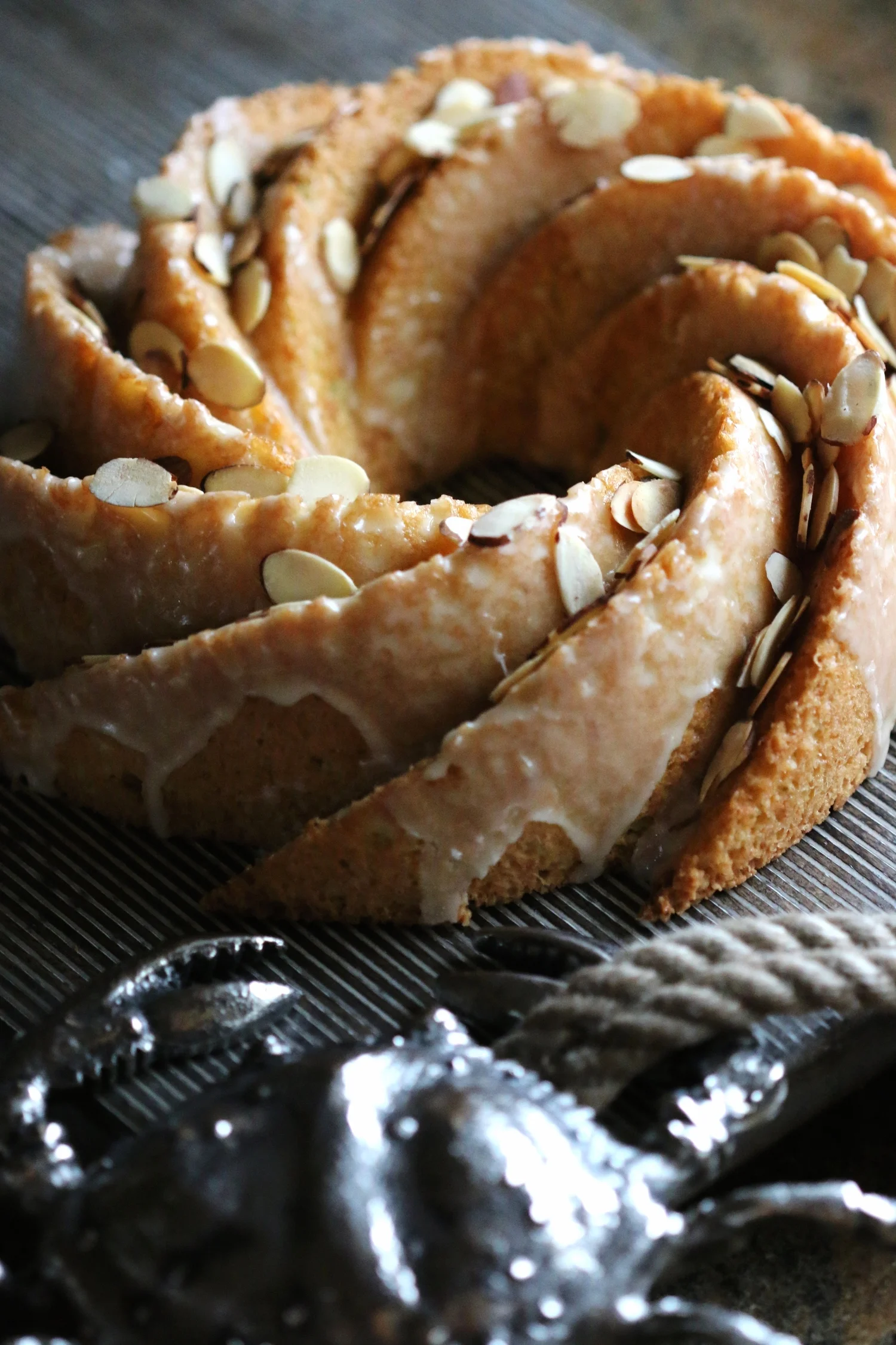 Ground almonds, sliced almonds and almond extract are blended to make this wonderful bundt cake. As with most bundt cakes, it is delicious without the glaze and almond topping. The glaze and toasted almonds add a little sweetness, a nutty flavor and a nice presentation.