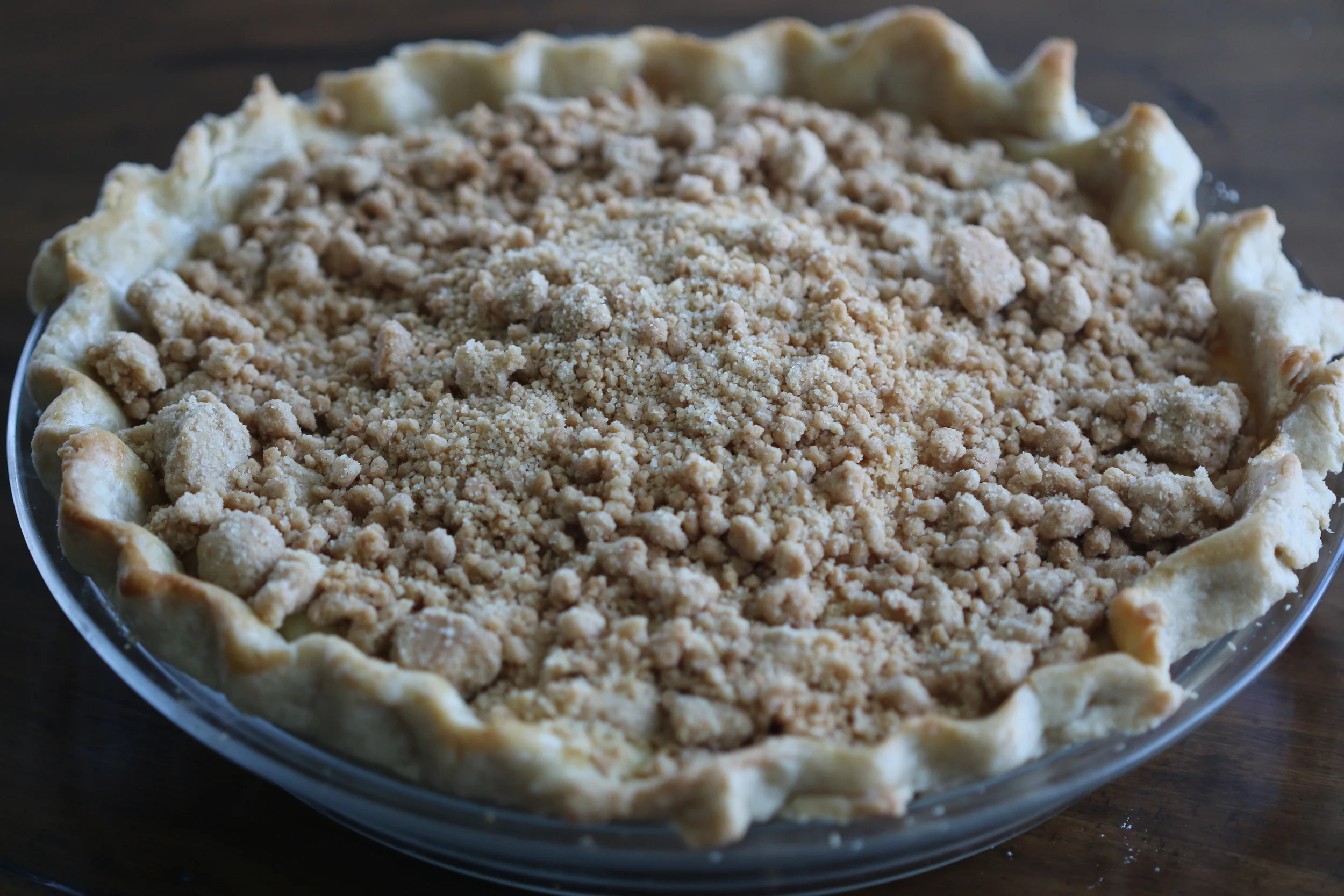 The pie crust and peanut butter crumbles should be baked and completely cooled before preparing the pie filling.