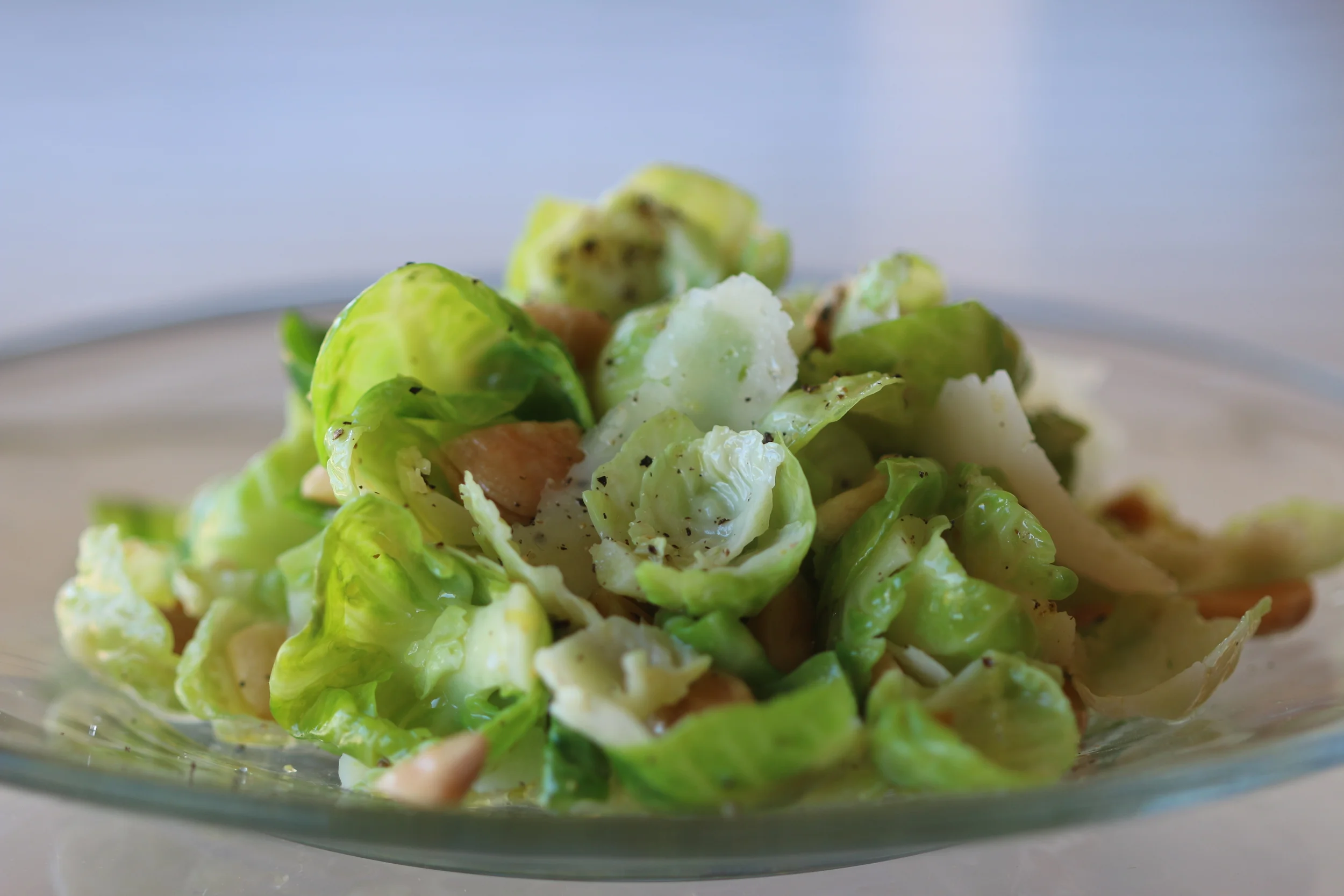5. Place the dried Brussels sprout leaves in a serving bowl with the almonds and vinaigrette. Toss until well coated. Add the cheese shavings and gently toss. Serve chilled.