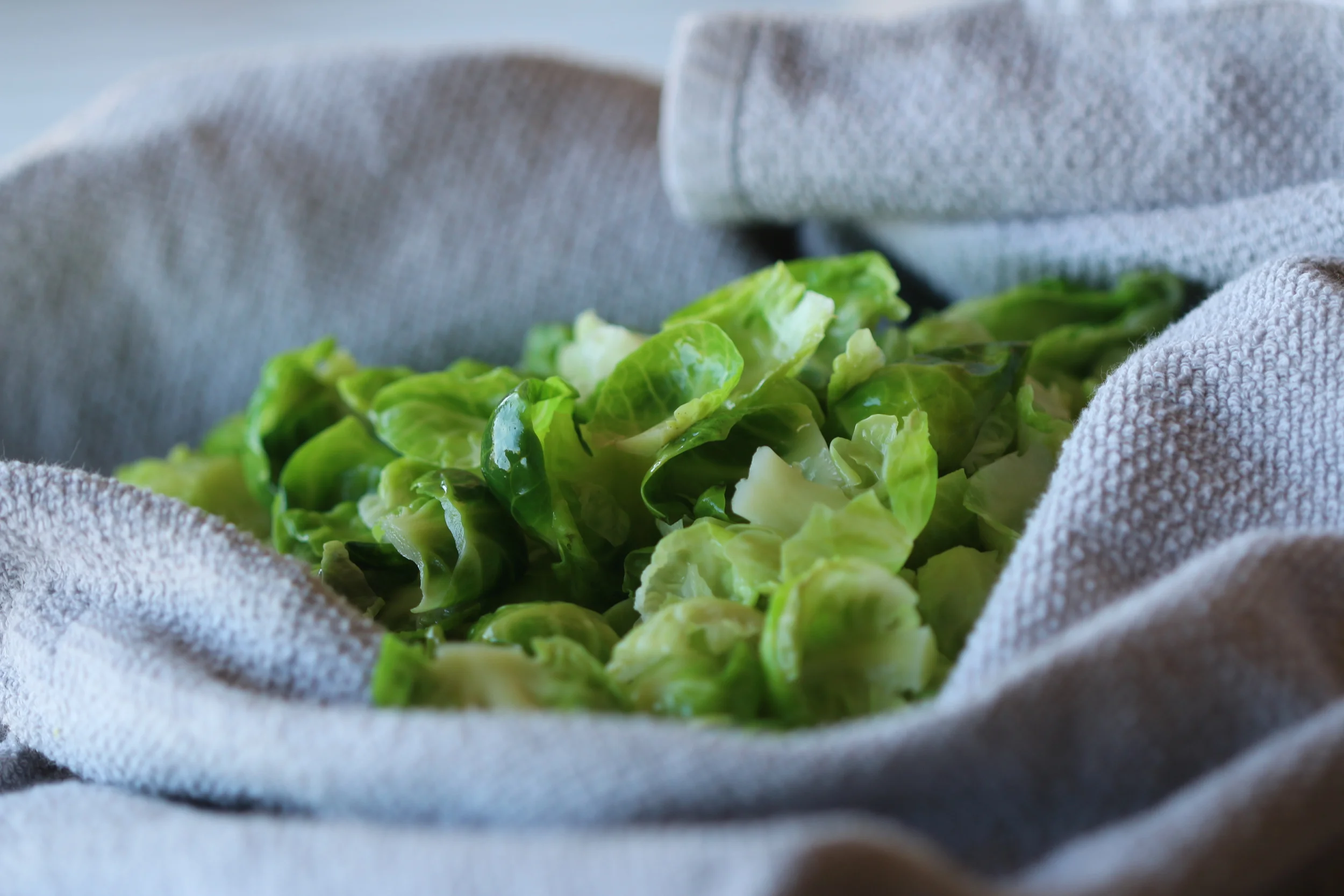 Please don't skip this step. After blanching and cooling, toss the brussels sprout leaves in a dishtowel or a salad spinner to remove as much moisture as possible.