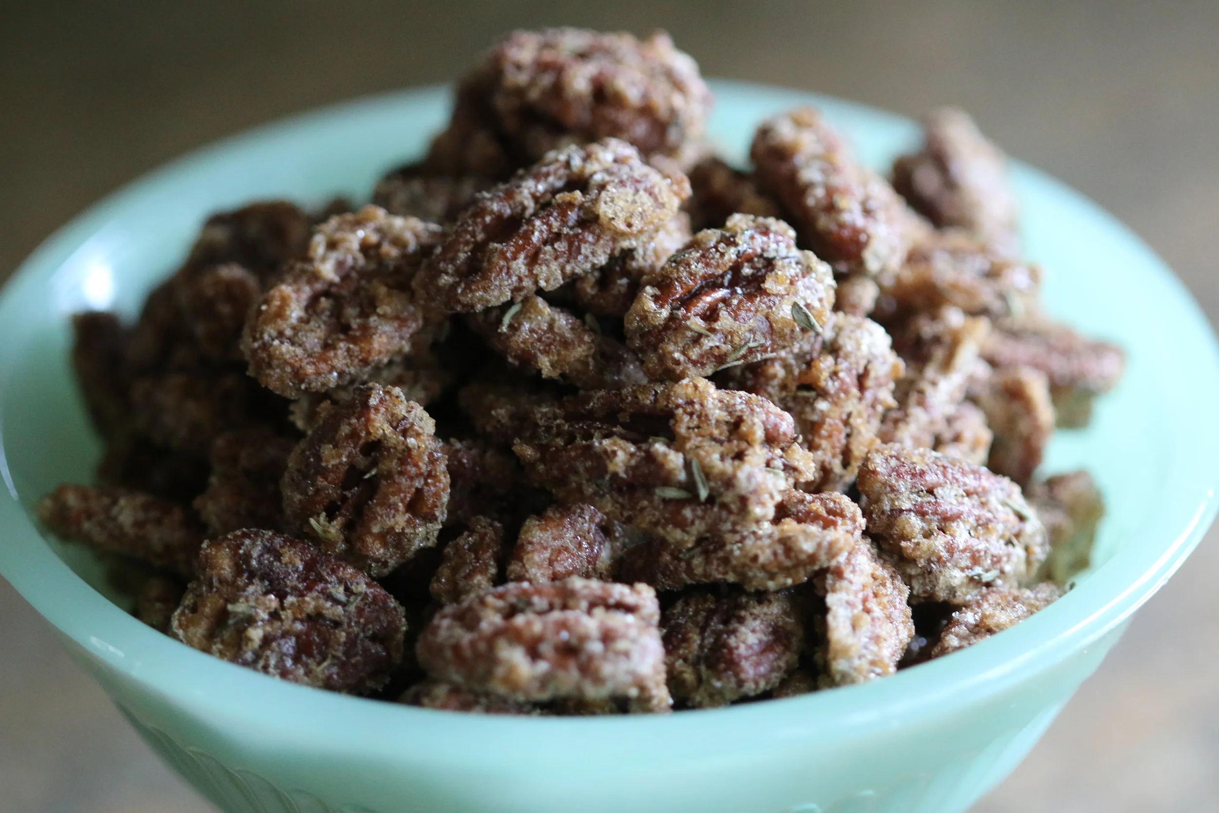 Candied thyme pecans are salt and sweet and roasted to a crunchy perfection. Delicious for holiday snacking or gift giving they're incredibly easy to prepare. Package the tasty morsels in cellophane bags, cute little jars, or gift tins and keep these ready as a holiday gift.