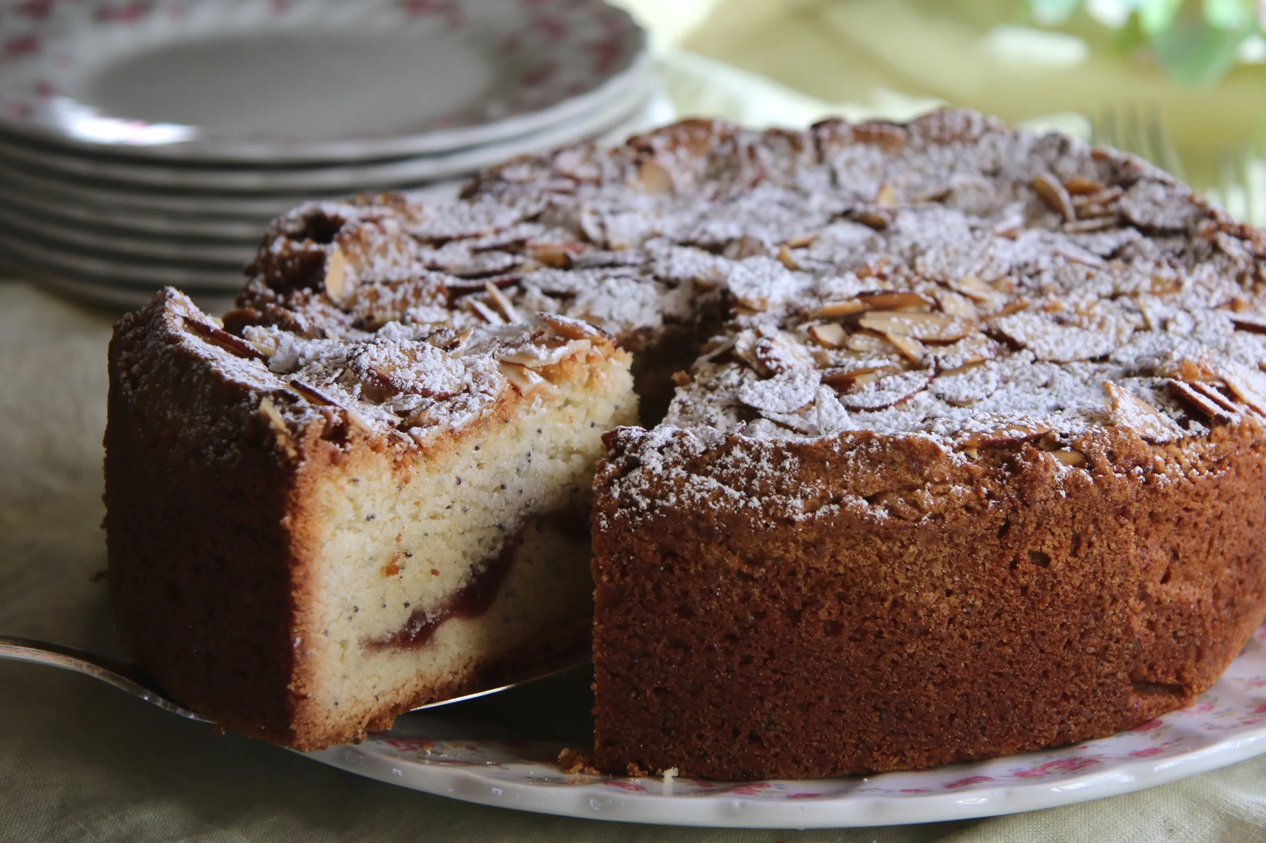 3. Evenly spread half the batter into the prepared pan. Spread the jam on top of the batter leaving a 1-inch border of batter. Drop spoonfuls of the remaining batter on top, and evenly smooth the batter. Sprinkle the almonds on top, and bake until a cake tester inserted into the center comes out clean, about 90 minutes. Cool completely before removing from pan. Dust the top with powdered sugar and serve.