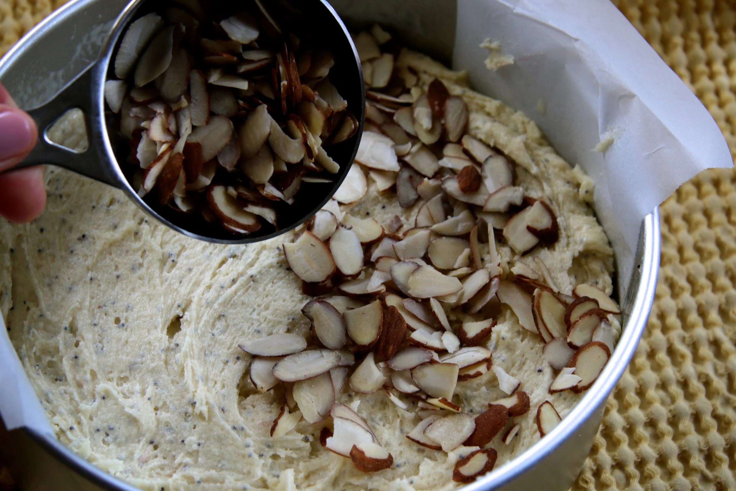 2. In a large mixing bowl, beat the sugar and butter until combined into a pebbly texture. Add the eggs and almond extract and beat until light and creamy, 2-3 minutes. Add the flour, poppy seeds and salt and mix until combined.