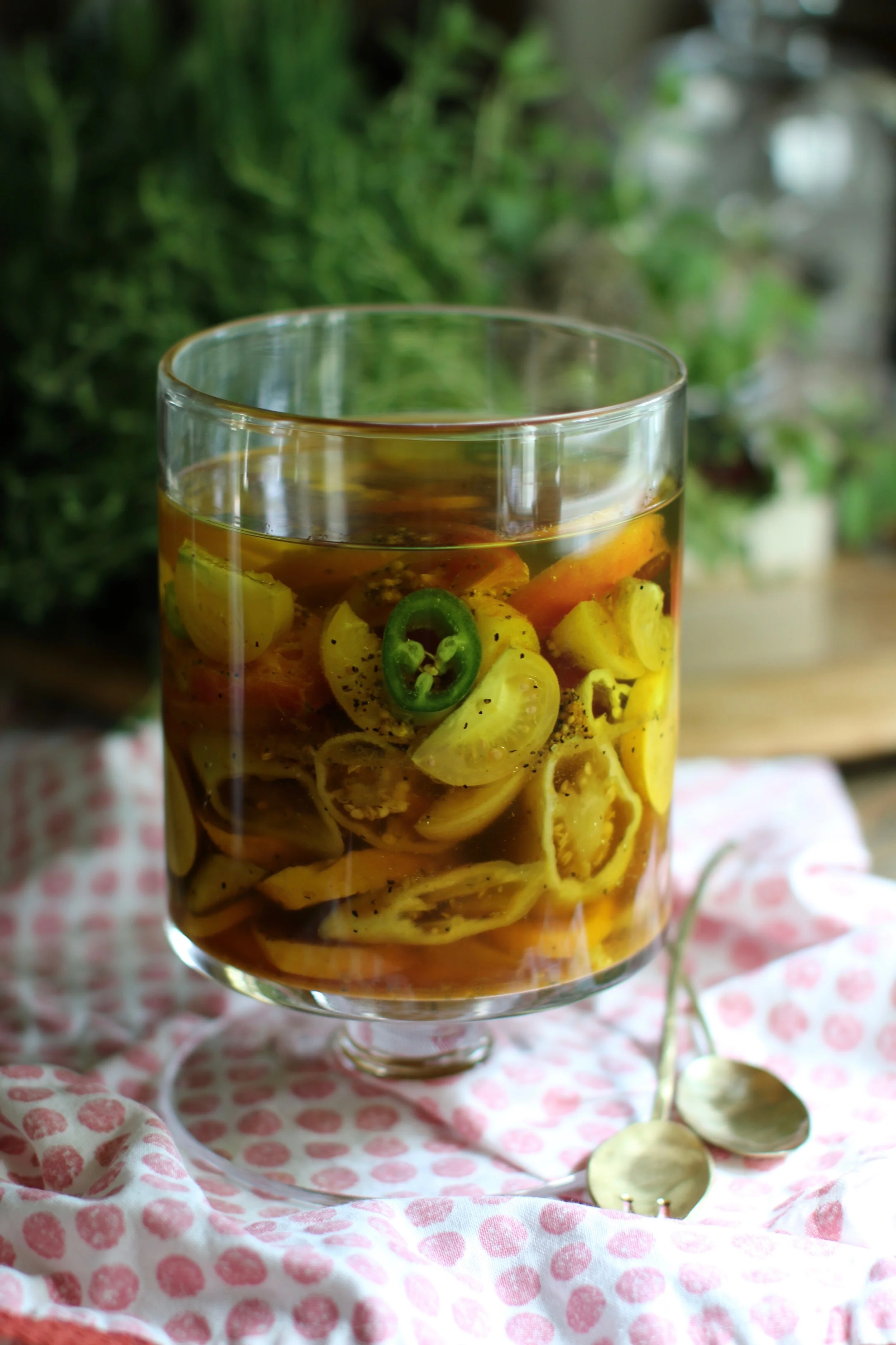There’s something about spring farmer’s markets that makes me want to pickle everything in sight. Pickling creates such vibrant flavors, and it’s perfect for warm weather picnics. Just a touch of turmeric is what adds adds a mild aromatic flavor to these seasonal pickled veggies. Although I love it with spring and summer veggies, I make this brine year round as it's one of my prep-ahead entertaining staples. My family enjoys having a batch of this in the refrigerator to serve as an accompaniment on a cheese plate, to toss into a green salad, or to layer into sandwiches and wraps. During the summer months I pickle tomatoes, banana peppers, bell peppers, jalapeño peppers, radishes, green beans and zucchini. I've also been known to toss in fruit such as sliced peaches and whole blueberries. The sweetness from the fruit pairs beautifully with the tangy brine. During the winter months I pickle cauliflower, carrots, beets, Brussels sprouts, fennel and butternut squash. No matter which time of year, select seasonal vegetables and preserve the seasons bounty with this flavorful brine.
