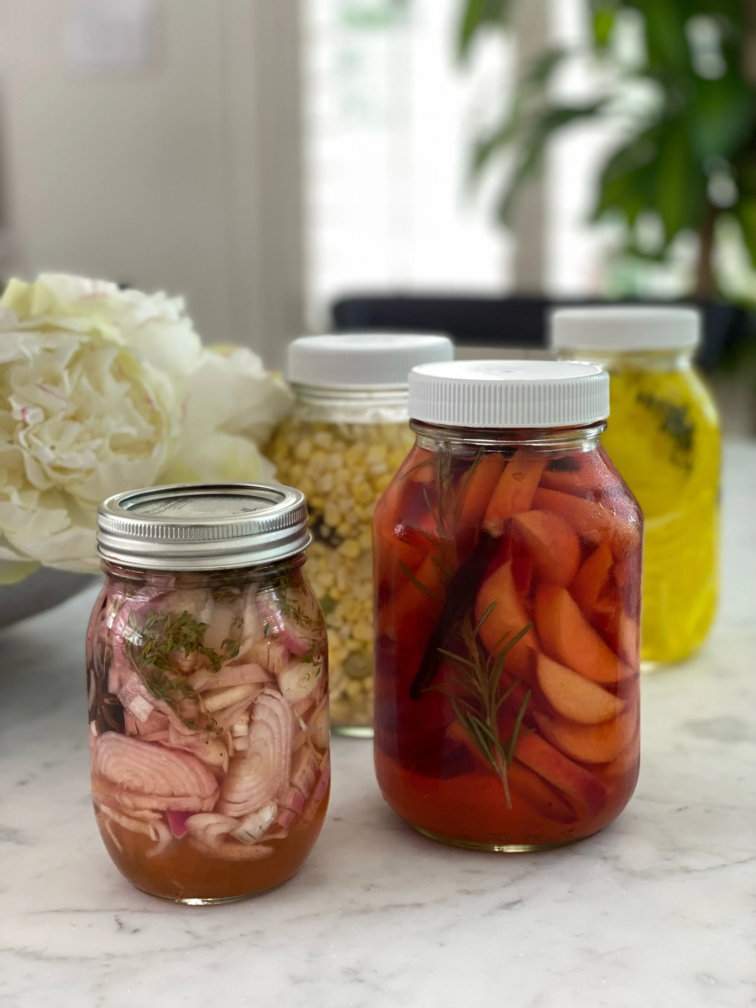 Pickling couldn't be easier. One simple pickle brine will transform any crunchy vegetable or berry in a couple of hours, burt preferably overnight. And yes, you can pickle corn right off the cob and blueberries, too. For added spice toss in chili flakes or sliced chili peppers. I've included some of my favorite flavor combinations, but be creative and discover your favorite blend. If you've never made pickles before-you're in a for a treat!