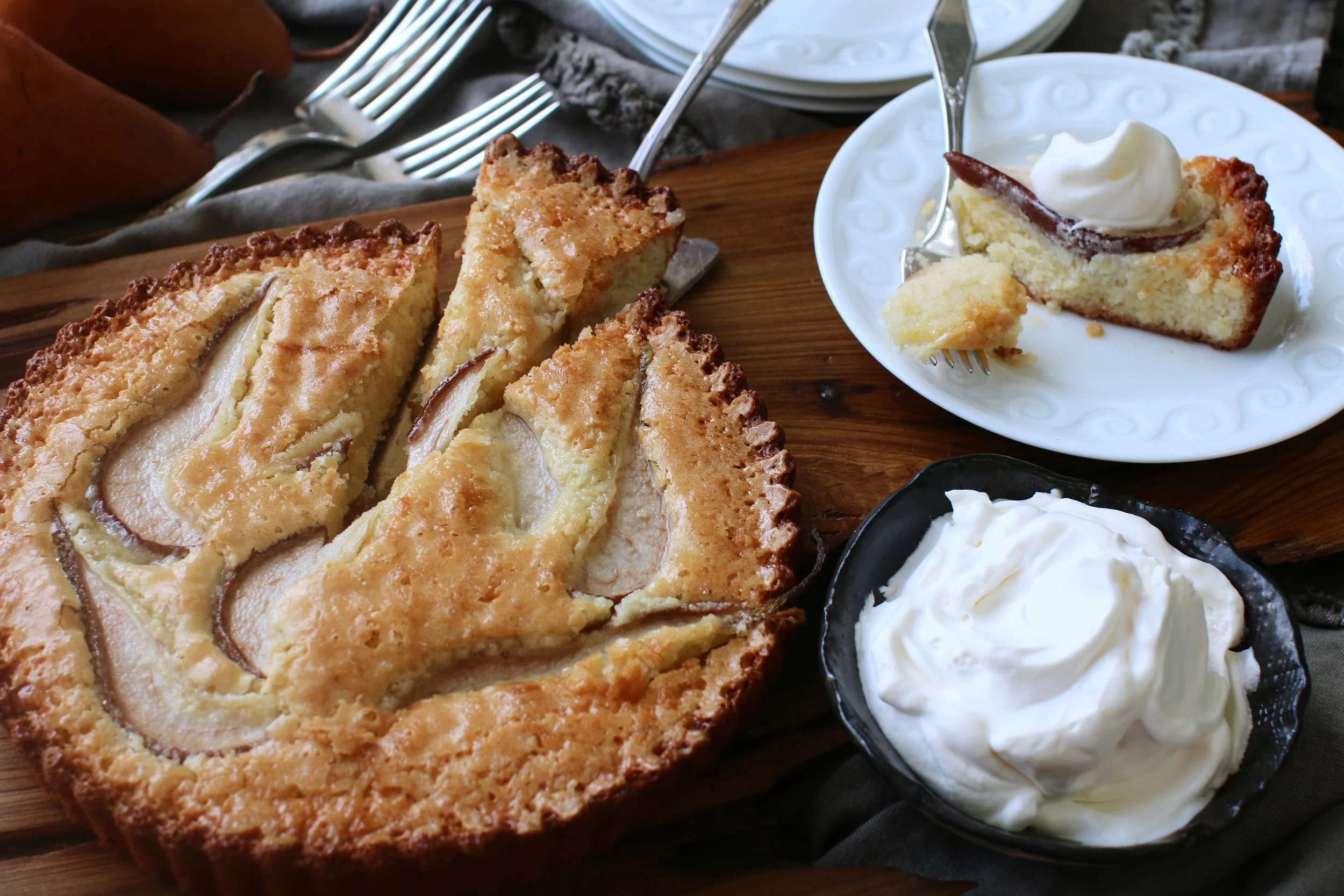 This almond and pear tart is a twist on a classic almond frangipane recipe. The delicious twist is actually tossing out the crust and only making the filling. I gave it a shot, and my kitchen concocting created a self crusting tart that is often requested by family and friends. The beauty is that you can top it with your favorite seasonal fruit. During the summer months I add sliced figs or stone fruit. As we head into the cooler months I usually top this tart with pears. No matter which fruit you select, this tart is always a crowd favorite with a dollop of whipped cream or ice cream.