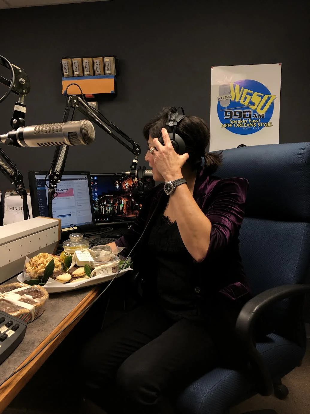 Yes, this is me right before I went live with the New Orleans Dine, Wine & Spirits Show with Tim McNally. This was so much fun chatting about the holidays, entertaining and my cookbook. Not only did I bring my Mookie Cookies I actually had Mookie join me in the studio. Christine gathered with her friends to listen in and my sweet husband sat in the car at home to to tune in. Mookie thanks for being a great stage mom and reminding me to sit up straight and stop swiveling so much. Thanks so much to everyone that tuned in and for Tim to Tim McNally at WGSO for having me on. Scroll down for the link to hear the podcast.