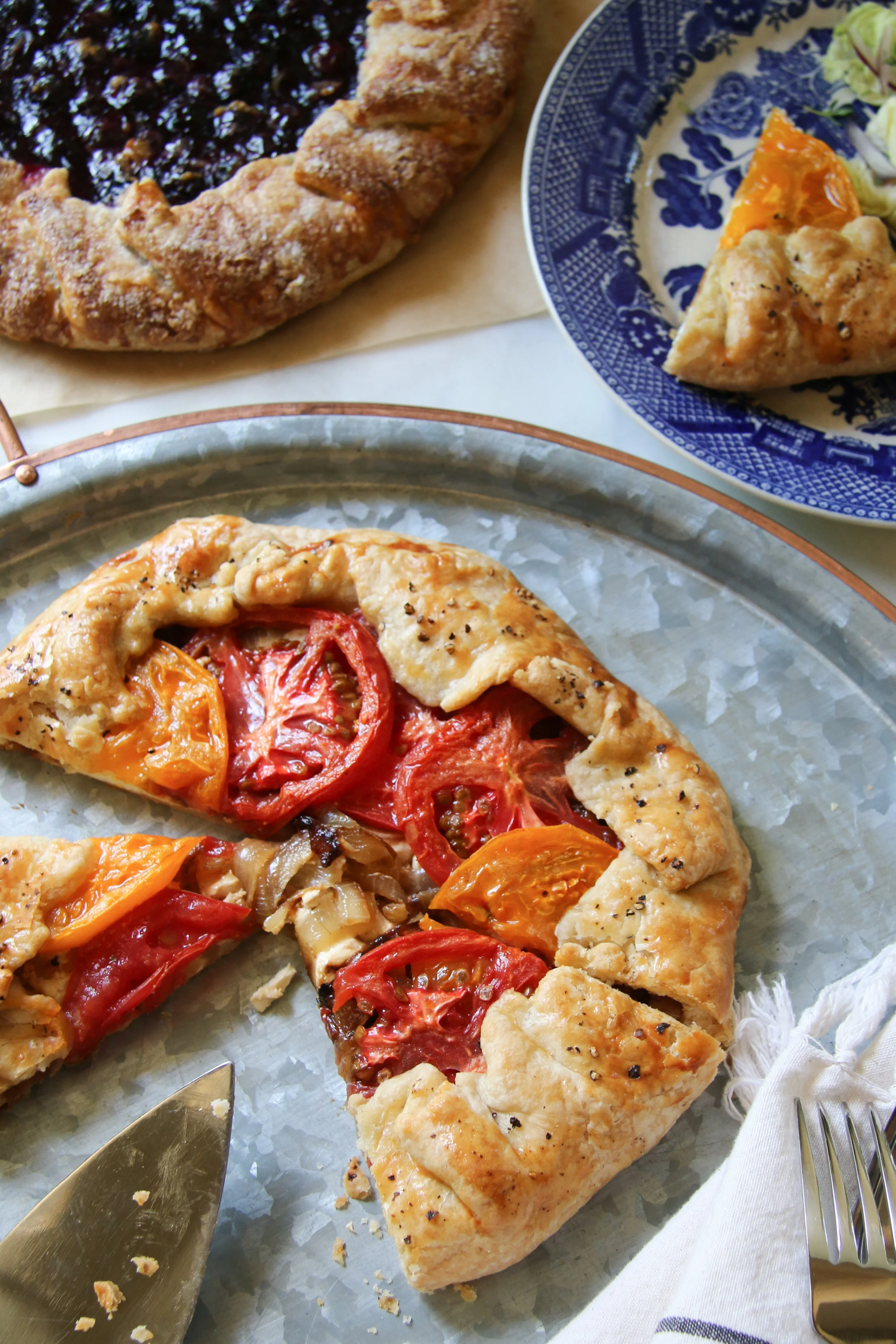 The Tomato Galette is a savory option that gets a flavor punch from a creamy base of goat cheese and caramelized onions. The deeply browned crust is complemented with fresh cracked pepper. A savory galette can be served with a garden salad for a delicious family style meal.