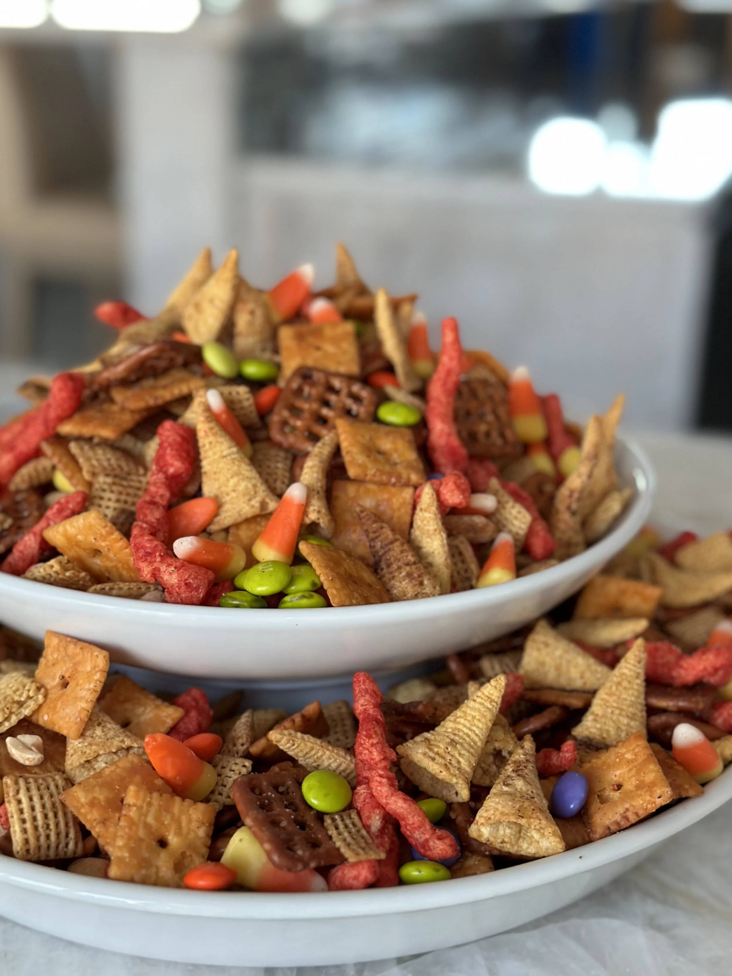 8. When completely cool in an extra large mixing bowl, combine baked mixture with the Flamin’ Hot Cheetos, M&M’s, roasted peanuts and candy corns. Store at room temperature in and air tight container. Alternately fill jars or gift bags for a delicious edible gift.