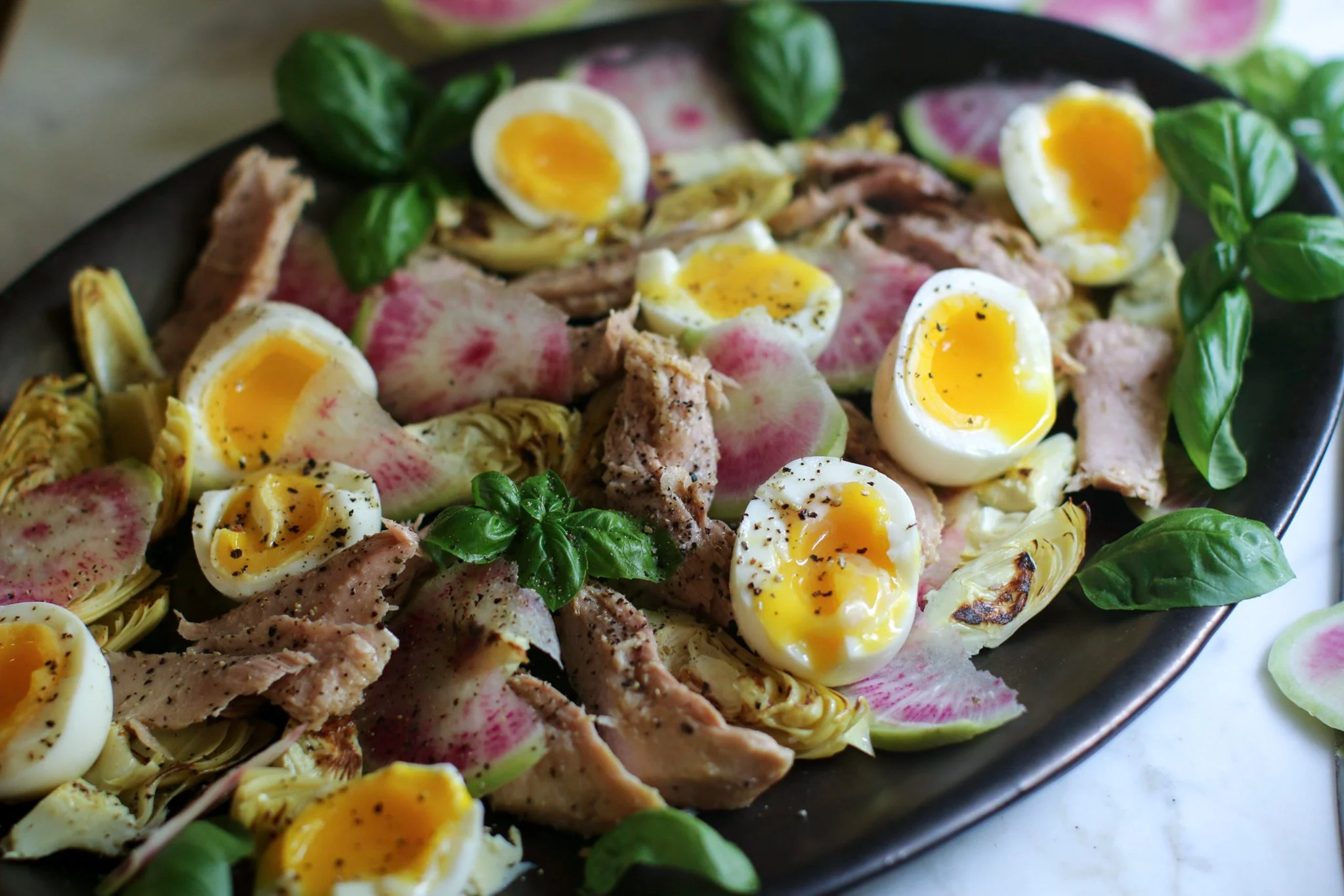 I love a jammy egg for breakfast, but honestly I add them to a variety of dishes from salads to hummus. For a simple meal I’ll spread thick yogurt on a platter and sprinkle it with everything seasoning. I’ll set the egg halves on the seasoned yogurt with fresh cracked pepper and toast. My go-to jammy egg preparation is this tuna platter. It doesn't need a recipe so I’ll just walk you through it. Adjust the ingredients to your liking. Here goes! I’d love to see how you create your own twist so share your photo with me at @y_delicacies .